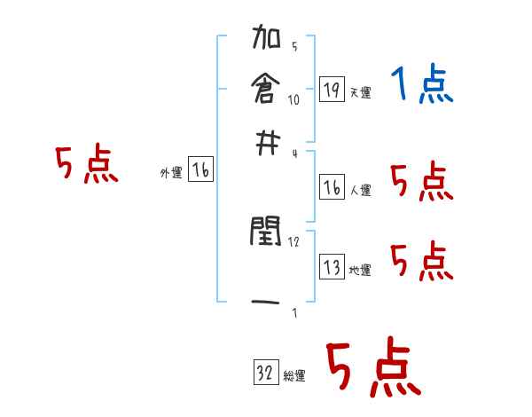 人運![]() | 加倉井閏一さんの人運は16画の5つ星!人望が厚く大きく発展する。逆転成功が見える。 性格や才能などを表す2番目に重要な運勢です。人間関係や協調性、社会的な成功に影響します。主に20歳から50歳ぐらいまでの中年期の運勢を表します。 |