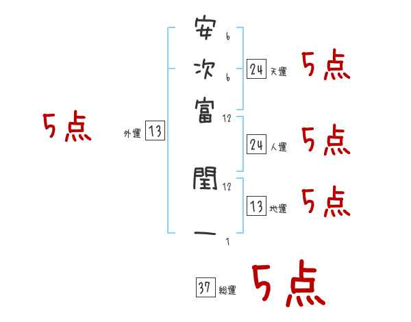 天運![]() | 安次富閏一さんの天運は24画の5つ星!家庭運が良く順調な人生。金運にも恵まれる。 家系が持つ宿命的な運勢を表します。祖先から受け継いだ苗字ですので自分の力が及びません。家柄を象徴します。 |