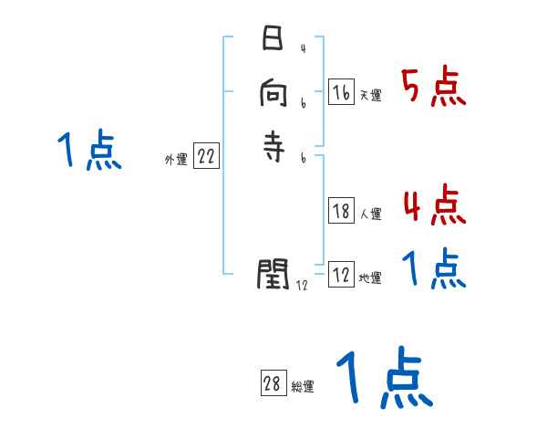 天運![]() | 日向寺閏さんの天運は16画の5つ星!人望が厚く大きく発展する。逆転成功が見える。 家系が持つ宿命的な運勢を表します。祖先から受け継いだ苗字ですので自分の力が及びません。家柄を象徴します。 |