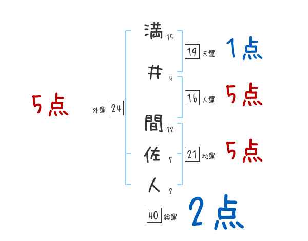 人運![]() | 満井間佐人さんの人運は16画の5つ星!人望が厚く大きく発展する。逆転成功が見える。 性格や才能などを表す2番目に重要な運勢です。人間関係や協調性、社会的な成功に影響します。主に20歳から50歳ぐらいまでの中年期の運勢を表します。 |