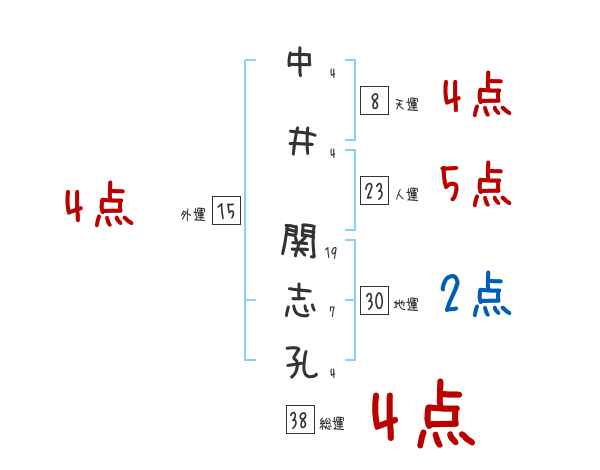 人運![]() | 中井関志孔さんの人運は23画の5つ星!想像力に優れ活力がある。一代で成功し名誉を手に入れる。 性格や才能などを表す2番目に重要な運勢です。人間関係や協調性、社会的な成功に影響します。主に20歳から50歳ぐらいまでの中年期の運勢を表します。 |