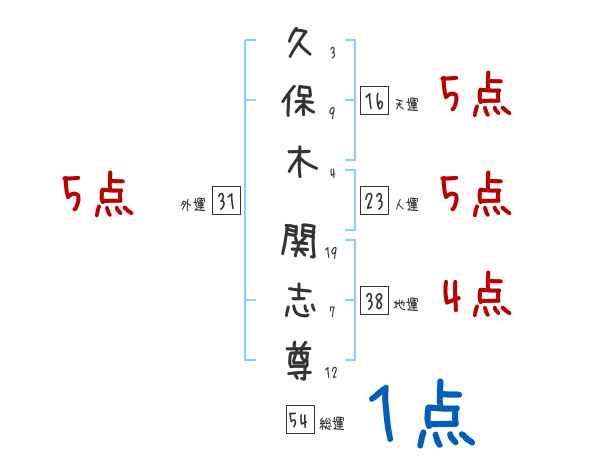 総運![]() | 久保木関志尊さんの総運は54画の1つ星!トラブルが多いかも。周りをよく見て協調して過ごしましょう。 あなたの人生を表す1番重要な運勢です。生涯を通じて影響する総合運となり、主に50歳以降の晩年期に影響を及ぼします。 |