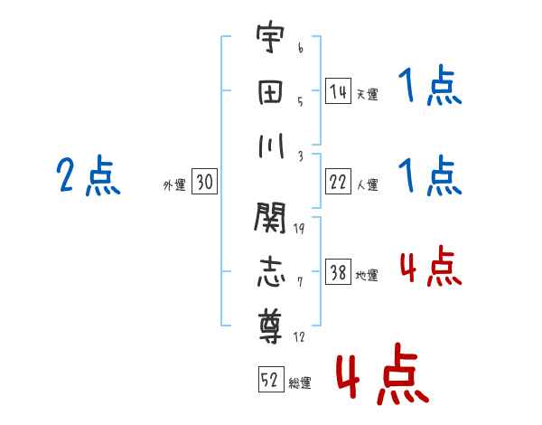 天運![]() | 宇田川関志尊さんの天運は14画の1つ星!人に対して優しいがストレスを溜め込みがち。人間関係のトラブルを避けるよう気をつけましょう。 家系が持つ宿命的な運勢を表します。祖先から受け継いだ苗字ですので自分の力が及びません。家柄を象徴します。 |