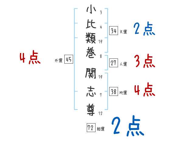 外運![]() | 小比類巻関志尊さんの外運は45画の4つ星!もくもくと物事を進め達成する。地味な努力家。 生活面を象徴する運勢です。外部から受ける影響力を表し、結婚運、家庭運や職場、環境への順応性を表します。 |