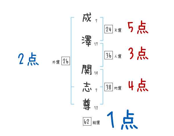 外運![]() | 成澤関志尊さんの外運は26画の2つ星!波瀾万丈かも。信頼できる人を大事にしましょう。 生活面を象徴する運勢です。外部から受ける影響力を表し、結婚運、家庭運や職場、環境への順応性を表します。 |
