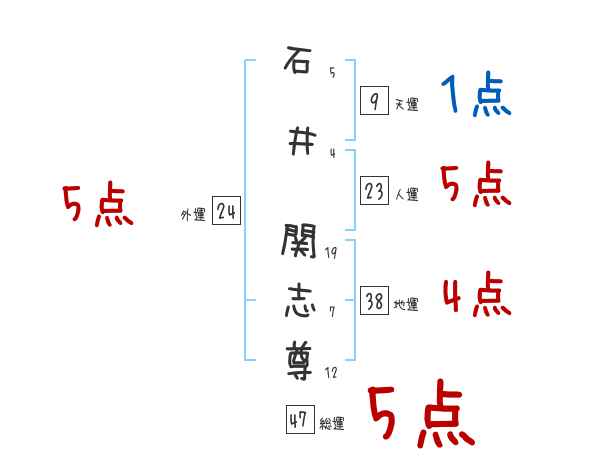 外運![]() | 石井関志尊さんの外運は24画の5つ星!家庭運が良く順調な人生。金運にも恵まれる。 生活面を象徴する運勢です。外部から受ける影響力を表し、結婚運、家庭運や職場、環境への順応性を表します。 |