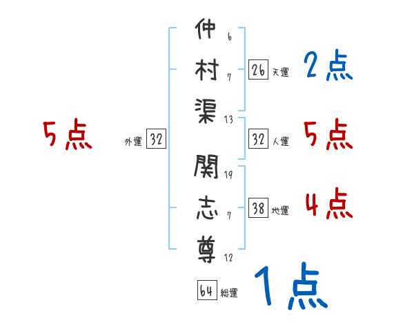 家系が持つ宿命的な運勢を表します。祖先から受け継いだ苗字ですので自分の力が及びません。家柄を象徴します。
