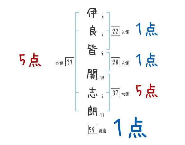 人運![]() | 伊良皆関志朗さんの人運は28画の1つ星!家庭環境に注意。スポーツで活躍できる能力があるかも。 性格や才能などを表す2番目に重要な運勢です。人間関係や協調性、社会的な成功に影響します。主に20歳から50歳ぐらいまでの中年期の運勢を表します。 |