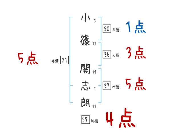 外運![]() | 小篠関志朗さんの外運は21画の5つ星!統率力がある。独立し成功する。名誉を手に入れる。 生活面を象徴する運勢です。外部から受ける影響力を表し、結婚運、家庭運や職場、環境への順応性を表します。 |
