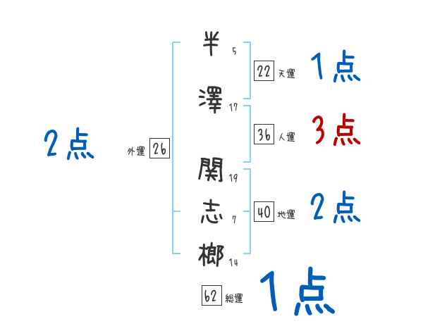 外運![]() | 半澤関志榔さんの外運は26画の2つ星!波瀾万丈かも。信頼できる人を大事にしましょう。 生活面を象徴する運勢です。外部から受ける影響力を表し、結婚運、家庭運や職場、環境への順応性を表します。 |