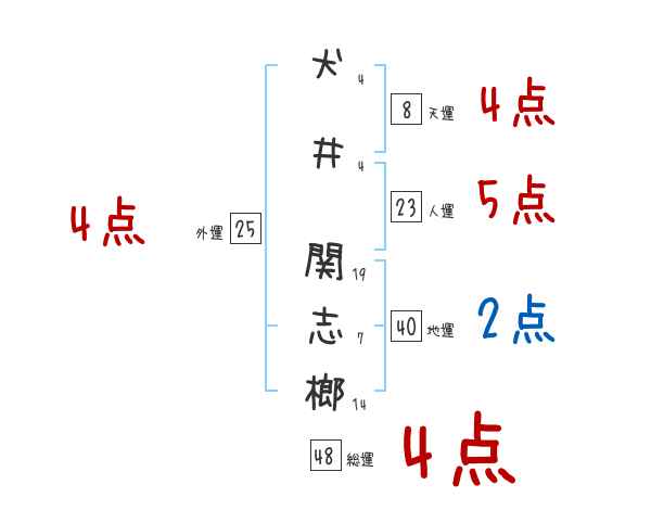 人運![]() | 犬井関志榔さんの人運は23画の5つ星!想像力に優れ活力がある。一代で成功し名誉を手に入れる。 性格や才能などを表す2番目に重要な運勢です。人間関係や協調性、社会的な成功に影響します。主に20歳から50歳ぐらいまでの中年期の運勢を表します。 |