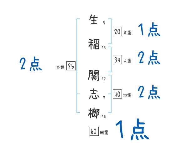 外運![]() | 生稲関志榔さんの外運は26画の2つ星!波瀾万丈かも。信頼できる人を大事にしましょう。 生活面を象徴する運勢です。外部から受ける影響力を表し、結婚運、家庭運や職場、環境への順応性を表します。 |