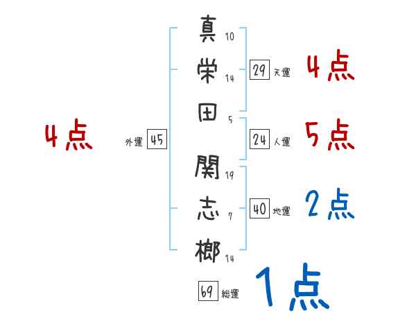 天運![]() | 真栄田関志榔さんの天運は29画の4つ星!完全主義で才能がある。厳格な心の持ち主。 家系が持つ宿命的な運勢を表します。祖先から受け継いだ苗字ですので自分の力が及びません。家柄を象徴します。 |