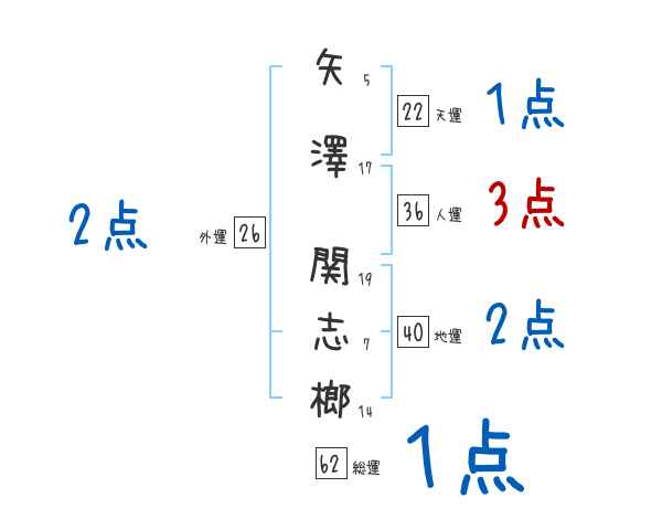 | 外運  | 矢澤関志榔さんの外運は26画の2つ星!波瀾万丈かも。信頼できる人を大事にしましょう。生活面を象徴する運勢です。外部から受ける影響力を表し、結婚運、家庭運や職場、環境への順応性を表します。 |