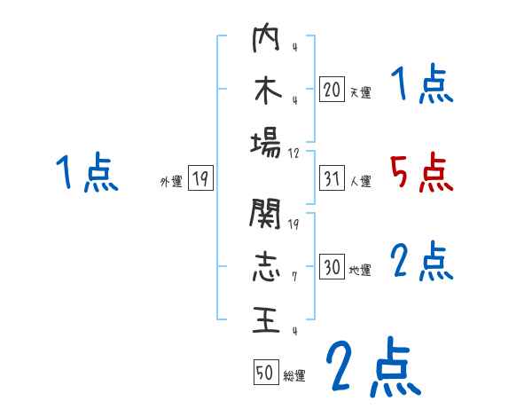外運![]() | 内木場関志王さんの外運は19画の1つ星!優れた才能を持ちますが、協調性が足りないことも。周りの人と協力する事を意識しましょう。 生活面を象徴する運勢です。外部から受ける影響力を表し、結婚運、家庭運や職場、環境への順応性を表します。 |
