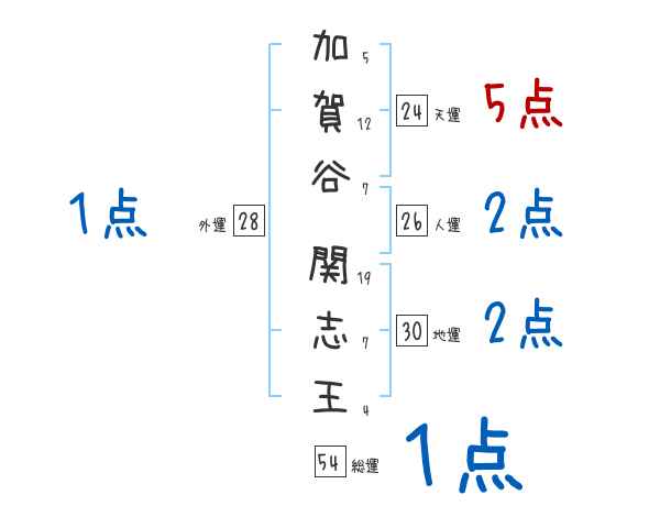 加賀谷関志王さんの画数の鑑定結果