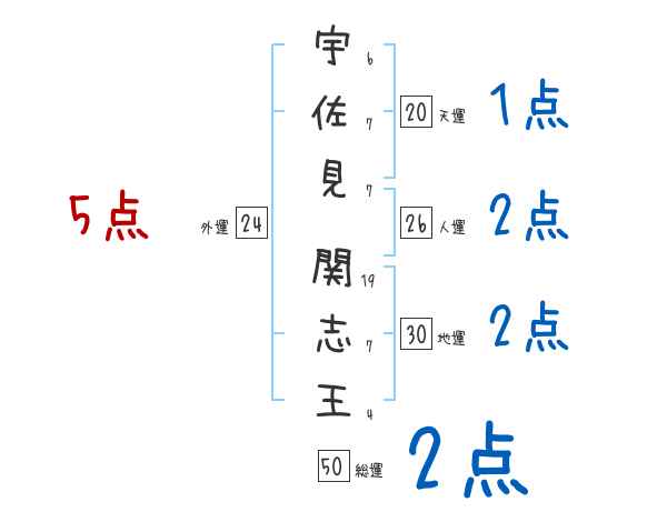 総運![]() | 宇佐見関志王さんの総運は50画の2つ星!浮き沈みが激しく不安定。しりすぼみに衰退しやすいので注意しましょう。 あなたの人生を表す1番重要な運勢です。生涯を通じて影響する総合運となり、主に50歳以降の晩年期に影響を及ぼします。 |