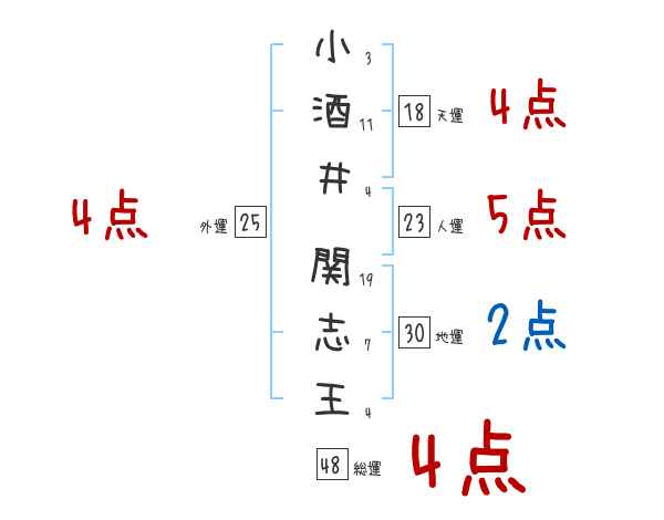 人運![]() | 小酒井関志王さんの人運は23画の5つ星!想像力に優れ活力がある。一代で成功し名誉を手に入れる。 性格や才能などを表す2番目に重要な運勢です。人間関係や協調性、社会的な成功に影響します。主に20歳から50歳ぐらいまでの中年期の運勢を表します。 |