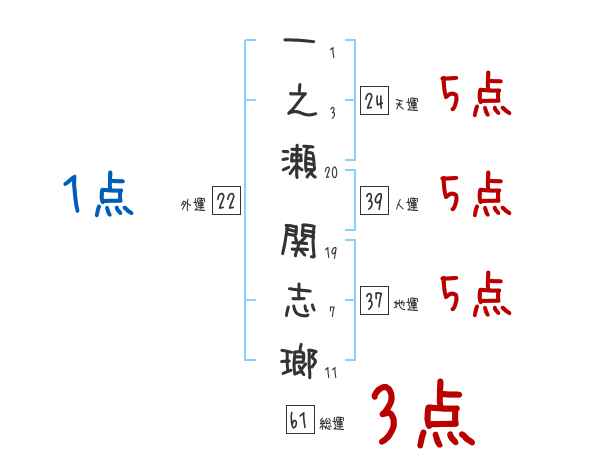 外運![]() | 一之瀬関志瑯さんの外運は22画の1つ星!努力することが苦手ないっぽう手先が器用。芸術性にも優れる。 生活面を象徴する運勢です。外部から受ける影響力を表し、結婚運、家庭運や職場、環境への順応性を表します。 |