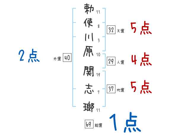 天運![]() | 勅使川原関志瑯さんの天運は32画の5つ星!柔軟性があり成功する。チャンスが多く金運が良い。 家系が持つ宿命的な運勢を表します。祖先から受け継いだ苗字ですので自分の力が及びません。家柄を象徴します。 |