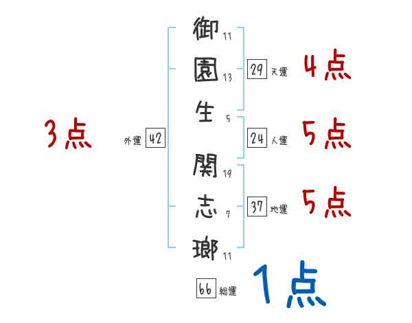外運![]() | 御園生関志瑯さんの外運は42画の3つ星!病気に注意。多芸であるが消極的でおとなしい。 生活面を象徴する運勢です。外部から受ける影響力を表し、結婚運、家庭運や職場、環境への順応性を表します。 |