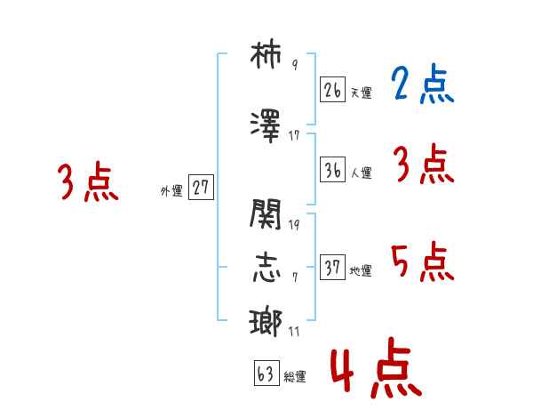 外運![]() | 柿澤関志瑯さんの外運は27画の3つ星!頭脳明晰だが強情で摩擦が多い傾向。孤立に注意。 生活面を象徴する運勢です。外部から受ける影響力を表し、結婚運、家庭運や職場、環境への順応性を表します。 |