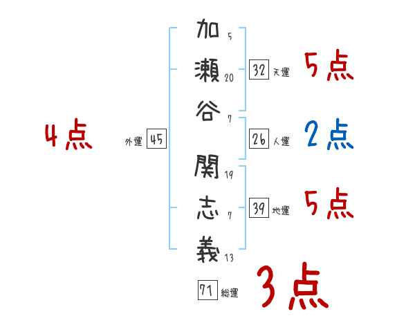天運![]() | 加瀬谷関志義さんの天運は32画の5つ星!柔軟性があり成功する。チャンスが多く金運が良い。 家系が持つ宿命的な運勢を表します。祖先から受け継いだ苗字ですので自分の力が及びません。家柄を象徴します。 |