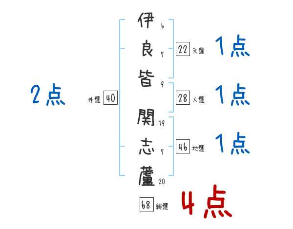 総運![]() | 伊良皆関志蘆さんの総運は68画の4つ星!潜在能力が高く集中力が高い。勤勉に励み発展する。 あなたの人生を表す1番重要な運勢です。生涯を通じて影響する総合運となり、主に50歳以降の晩年期に影響を及ぼします。 |
