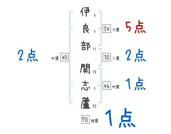 天運![]() | 伊良部関志蘆さんの天運は24画の5つ星!家庭運が良く順調な人生。金運にも恵まれる。 家系が持つ宿命的な運勢を表します。祖先から受け継いだ苗字ですので自分の力が及びません。家柄を象徴します。 |