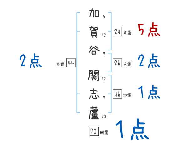 天運![]() | 加賀谷関志蘆さんの天運は24画の5つ星!家庭運が良く順調な人生。金運にも恵まれる。 家系が持つ宿命的な運勢を表します。祖先から受け継いだ苗字ですので自分の力が及びません。家柄を象徴します。 |