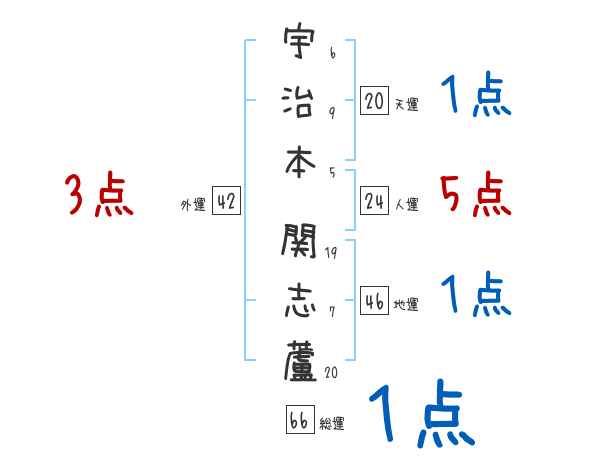 人運![]() | 宇治本関志蘆さんの人運は24画の5つ星!家庭運が良く順調な人生。金運にも恵まれる。 性格や才能などを表す2番目に重要な運勢です。人間関係や協調性、社会的な成功に影響します。主に20歳から50歳ぐらいまでの中年期の運勢を表します。 |