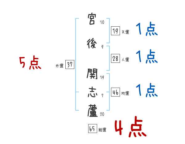 総運![]() | 宮後関志蘆さんの総運は65画の4つ星!幸運に恵まれ繁栄する。包容力がある。 あなたの人生を表す1番重要な運勢です。生涯を通じて影響する総合運となり、主に50歳以降の晩年期に影響を及ぼします。 |