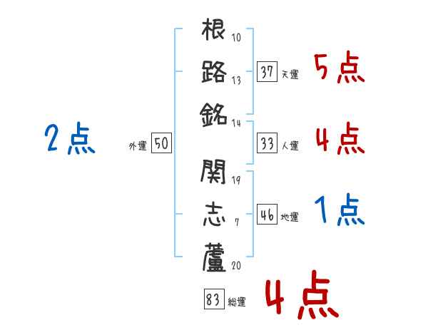 天運![]() | 根路銘関志蘆さんの天運は37画の5つ星!努力家で順応性に優れる。現実的な考え方ができ忠実に物事をこなす。 家系が持つ宿命的な運勢を表します。祖先から受け継いだ苗字ですので自分の力が及びません。家柄を象徴します。 |