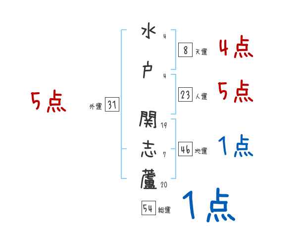 人運![]() | 水戸関志蘆さんの人運は23画の5つ星!想像力に優れ活力がある。一代で成功し名誉を手に入れる。 性格や才能などを表す2番目に重要な運勢です。人間関係や協調性、社会的な成功に影響します。主に20歳から50歳ぐらいまでの中年期の運勢を表します。 |
