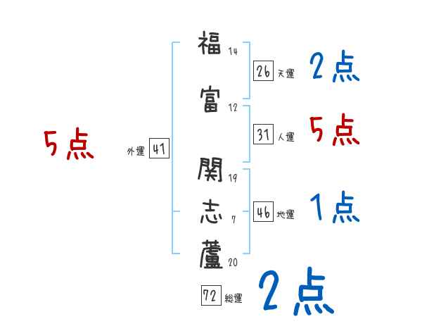 総運![]() | 福富関志蘆さんの総運は72画の2つ星!災難が多く不安定な生活にならないように注意。明暗のある人生かも。 あなたの人生を表す1番重要な運勢です。生涯を通じて影響する総合運となり、主に50歳以降の晩年期に影響を及ぼします。 |