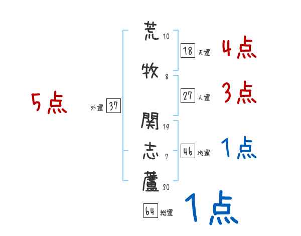 外運![]() | 荒牧関志蘆さんの外運は37画の5つ星!努力家で順応性に優れる。現実的な考え方ができ忠実に物事をこなす。 生活面を象徴する運勢です。外部から受ける影響力を表し、結婚運、家庭運や職場、環境への順応性を表します。 |