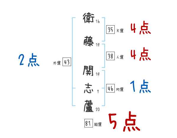 天運![]() | 衛藤関志蘆さんの天運は35画の4つ星!温厚な性格で感受性が高い。穏和な性格で人望が厚い。 家系が持つ宿命的な運勢を表します。祖先から受け継いだ苗字ですので自分の力が及びません。家柄を象徴します。 |