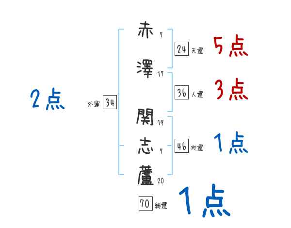 天運![]()  | 赤澤関志蘆さんの天運は24画の5つ星!家庭運が良く順調な人生。金運にも恵まれる。 家系が持つ宿命的な運勢を表します。祖先から受け継いだ苗字ですので自分の力が及びません。家柄を象徴します。 |