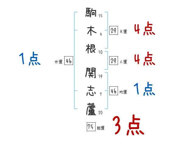 天運![]() | 駒木根関志蘆さんの天運は29画の4つ星!完全主義で才能がある。厳格な心の持ち主。 家系が持つ宿命的な運勢を表します。祖先から受け継いだ苗字ですので自分の力が及びません。家柄を象徴します。 |