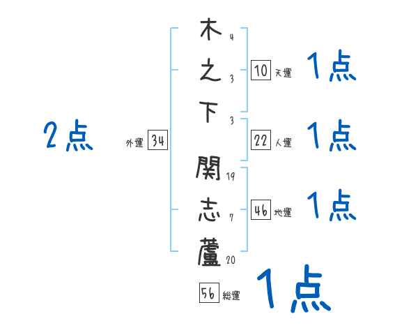 人運![]() | 木之下関志蘆さんの人運は22画の1つ星!努力することが苦手ないっぽう手先が器用。芸術性にも優れる。 性格や才能などを表す2番目に重要な運勢です。人間関係や協調性、社会的な成功に影響します。主に20歳から50歳ぐらいまでの中年期の運勢を表します。 |