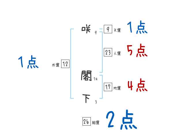 天運![]() | 咲閣下さんの天運は9画の1つ星!消極的で才能を発揮することが苦手なことも。周りの意見に耳を傾けましょう。 家系が持つ宿命的な運勢を表します。祖先から受け継いだ苗字ですので自分の力が及びません。家柄を象徴します。 |