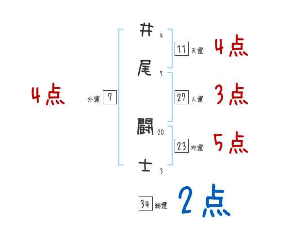 天運![]() | 井尾闘士さんの天運は11画の4つ星!着実に富や地位を得る幸運な人生。 家系が持つ宿命的な運勢を表します。祖先から受け継いだ苗字ですので自分の力が及びません。家柄を象徴します。 |