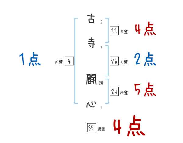 天運![]() | 古寺闘心さんの天運は11画の4つ星!着実に富や地位を得る幸運な人生。 家系が持つ宿命的な運勢を表します。祖先から受け継いだ苗字ですので自分の力が及びません。家柄を象徴します。 |