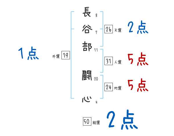 天運![]() | 長谷部闘心さんの天運は26画の2つ星!波瀾万丈かも。信頼できる人を大事にしましょう。 家系が持つ宿命的な運勢を表します。祖先から受け継いだ苗字ですので自分の力が及びません。家柄を象徴します。 |