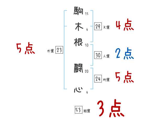 総運![]() | 駒木根闘心さんの総運は53画の3つ星!やや見栄っ張りで虚栄心がある。散財に注意。 あなたの人生を表す1番重要な運勢です。生涯を通じて影響する総合運となり、主に50歳以降の晩年期に影響を及ぼします。 |