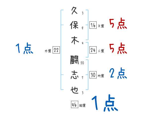 総運![]() | 久保木闘志也さんの総運は46画の1つ星!迷走することが多く苦労するかも。目先のことにとらわれないように。 あなたの人生を表す1番重要な運勢です。生涯を通じて影響する総合運となり、主に50歳以降の晩年期に影響を及ぼします。 |
