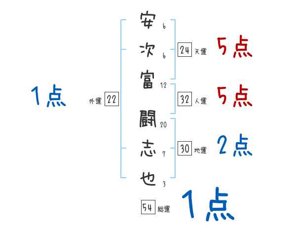 人運![]() | 安次富闘志也さんの人運は32画の5つ星!柔軟性があり成功する。チャンスが多く金運が良い。 性格や才能などを表す2番目に重要な運勢です。人間関係や協調性、社会的な成功に影響します。主に20歳から50歳ぐらいまでの中年期の運勢を表します。 |