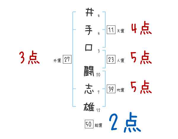 外運![]()  | 井手口闘志雄さんの外運は27画の3つ星!頭脳明晰だが強情で摩擦が多い傾向。孤立に注意。 生活面を象徴する運勢です。外部から受ける影響力を表し、結婚運、家庭運や職場、環境への順応性を表します。 |
