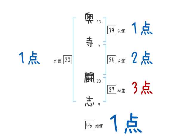 天運![]() | 奥寺闘志さんの天運は19画の1つ星!優れた才能を持ちますが、協調性が足りないことも。周りの人と協力する事を意識しましょう。 家系が持つ宿命的な運勢を表します。祖先から受け継いだ苗字ですので自分の力が及びません。家柄を象徴します。 |