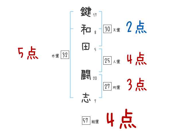 外運![]() | 鍵和田闘志さんの外運は32画の5つ星!柔軟性があり成功する。チャンスが多く金運が良い。 生活面を象徴する運勢です。外部から受ける影響力を表し、結婚運、家庭運や職場、環境への順応性を表します。 |